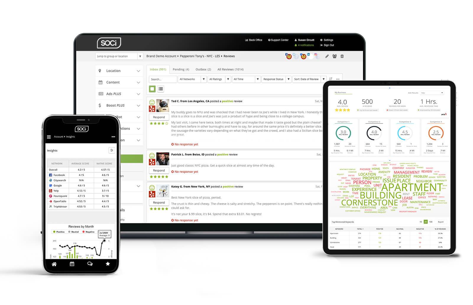 In terms of reputation management, SOCi’s streamlined reputation management software allows users to view every action taken on reviews and monitor every activity on social media. Now, your local, regional, and corporate teams will always know which reviews and social engagements you’ve addressed and which ones still require attention to ensure the prompt responses consumers expect. Through this tool, your multi-location business will be able to respond to reviews more quickly and personalize, again increasing your visibility in the Google 3-Pack.