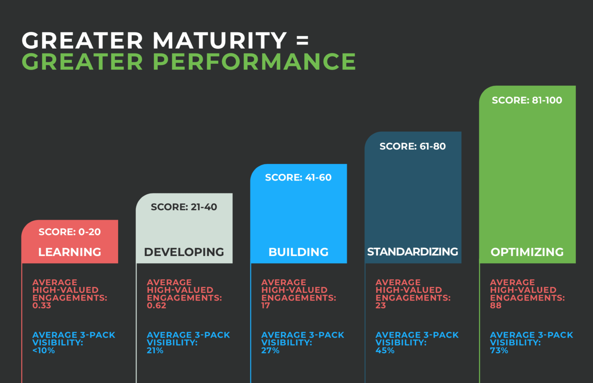Now that you understand what factors the maturity model considers when ranking a business let’s get into how to determine your score. The maturity model is pretty straightforward. There are five different stages where a business can land based on your average high-valued engagements and visibility in the Google 3-Pack, as seen below.