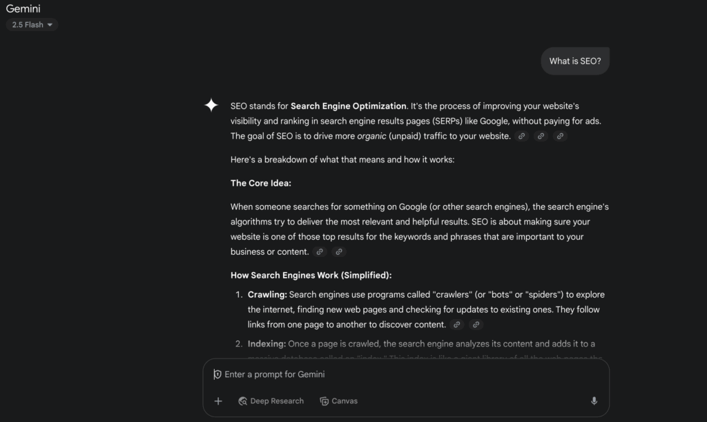 Google, historically dominant in traditional search, has expanded its capabilities significantly through AI. Google’s Gemini, initially introduced as Bard in 2023 and rebranded in February 2024, is a multimodal AI model that integrates diverse data forms—including text, audio, images, and video—to deliver rich, contextually relevant search results. Gemini powers Google’s AI Overviews and AI Mode, transforming standard search results into interactive, AI-generated responses. AI Overviews and AI Mode enhance traditional search by providing users immediate, concise answers synthesized from across multiple web sources, greatly streamlining the user experience and setting new standards for search effectiveness and engagement.