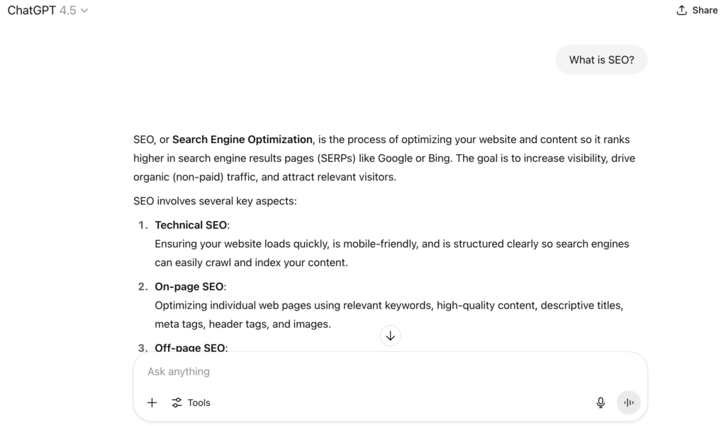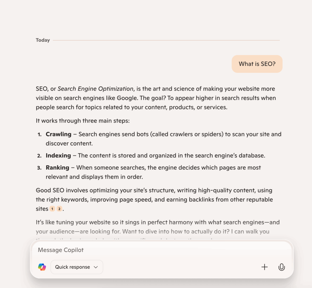 Microsoft entered the AI search space aggressively by launching Bing Chat in early 2023, powered primarily by OpenAI’s GPT-4 technology. In November 2023, Microsoft rebranded Bing Chat to Copilot, integrating more deeply across its platforms and significantly expanding capabilities. Copilot delivers conversational, contextually informed interactions within Bing, Microsoft 365, and various other enterprise applications. Its ability to engage in extended dialogue and produce sophisticated, accurate responses positions Copilot as a strong competitor to Google’s Gemini, influencing how businesses optimize for search visibility.