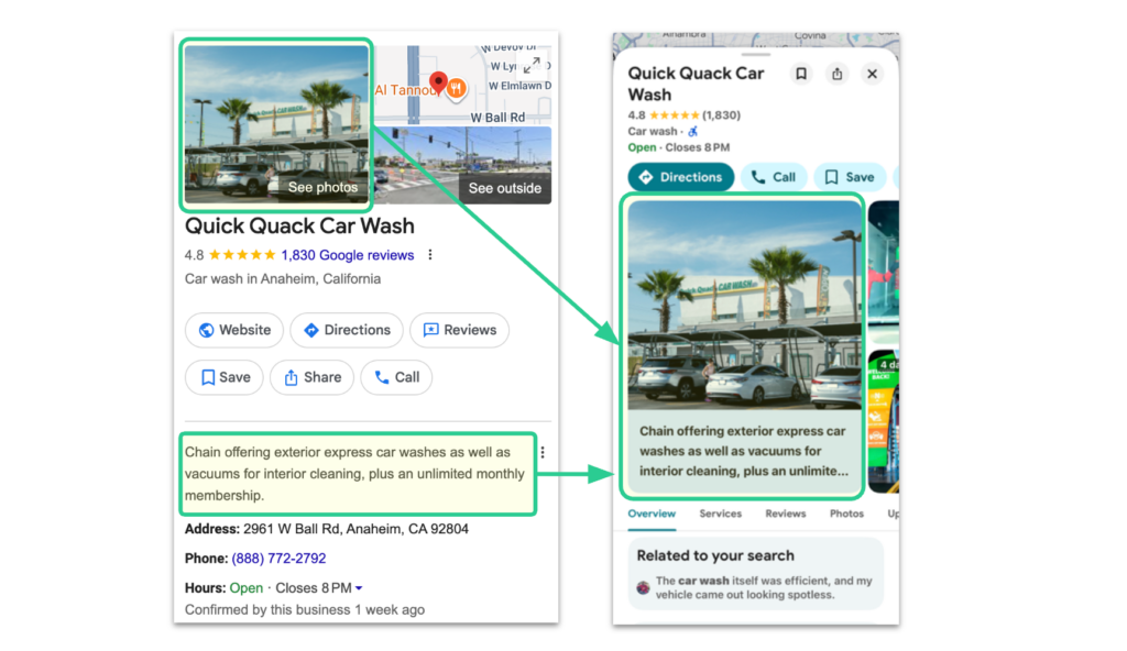 Recently, we noticed a significant new behavior: Google is now pairing a business’s “Editorial Summary” directly with the first photo in that carousel.
