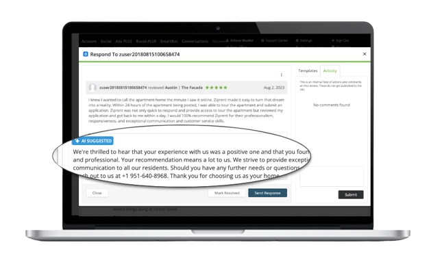 SOCi’s review management tools make it easy to monitor and respond to reviews across all your locations from one centralized platform. Genius Reviews combines cutting-edge AI technology, advanced on-brand training models, and leading localization and automation tools to deliver a highly customizable and automated system for managing reviews. This innovative tool integrates with major review sites, including Google, Facebook, and Yelp. It utilizes proprietary “On-Brand” training models and prompts to provide fast and accurate responses to customer reviews in real-time, making the customer feel valued and heard.