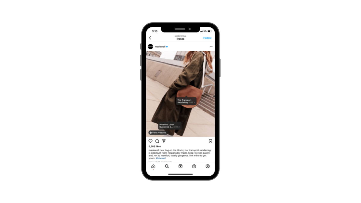 It’s also important not to let product tags slip through the cracks. You’ve probably seen them before. Product tags can be used on Instagram and Facebook and are often seen in posts highlighting products, as shown in the example below. Product tags can link back to your Facebook Shops and again give consumers easy access to your inventory.