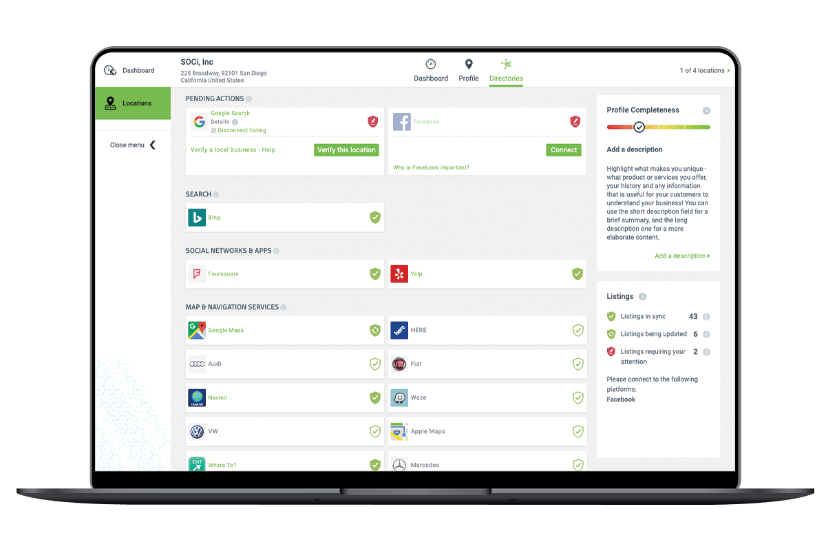 Strong local GMB profiles play a significant role in online visibility through Google, so the more information your business has in its local GMB profiles, the better. These features make it easier for your business to update its GMB profiles and ultimately rank higher on Google. If your business is worried about managing your local GMB profiles across all business locations, SOCi is here to help. SOCi Listings empowers you to manage your business listings at scale and effectively optimize your online presence and local search rankings. From syncing, updating, and managing your local listings to custom audits and profile recommendations, SOCi Listings covers every step of the process to launch your listings to the top of search results.