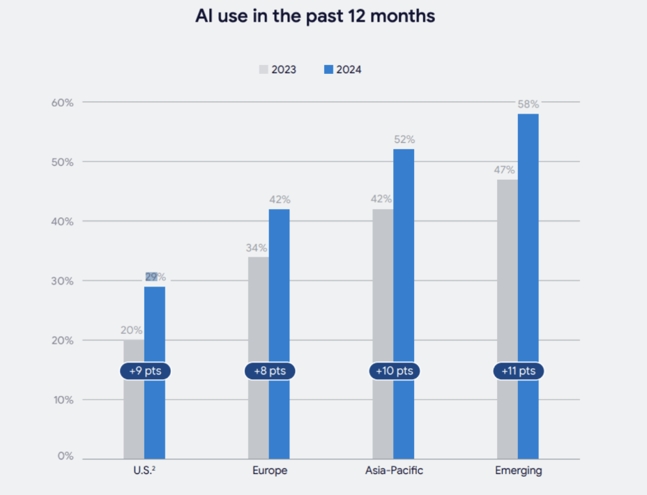 A newly published Google-Ipsos survey finds that AI usage continues to grow globally, though growth is, somewhat surprisingly, stronger in countries outside the U.S. and Canada. Whereas 48% of respondents across the globe reported that they’ve used AI tools in the past year, that number drops to just 29% for the U.S. and Canada. Adoption rates are stronger in Europe, in the Asia-Pacific, and in emerging nations.