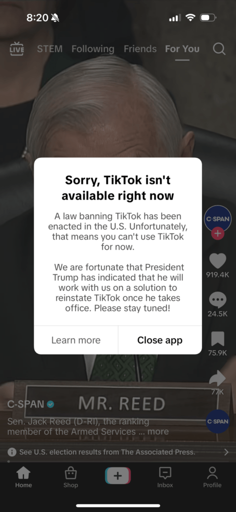 For now, TikTok is back for the 170 million Americans who are already active users. However, the future remains highly uncertain. ByteDance has still not indicated a willingness to divest any portion of TikTok’s U.S. ownership. The legality of the executive order that revived the app may come under further scrutiny. And while TikTok’s removal from the Apple and Google app stores continues, usership cannot grow, those who delete the app cannot reinstall it, and some app functions may be unavailable, though TikTok Shop purchases appear to be unaffected.