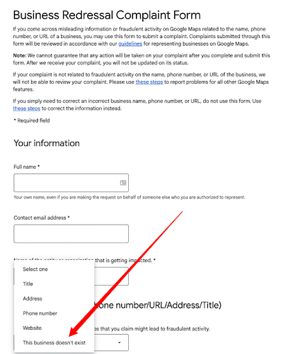 In a small but significant update, Google has added the option “This business doesn’t exist” to its Business Redressal Complaint Form, the form provided for users to report fraudulent content on Google Maps. Previously, Google only permitted users to flag the business name, phone number, address, or website as fraudulent; now, users can specify that the business in question does not exist at all.