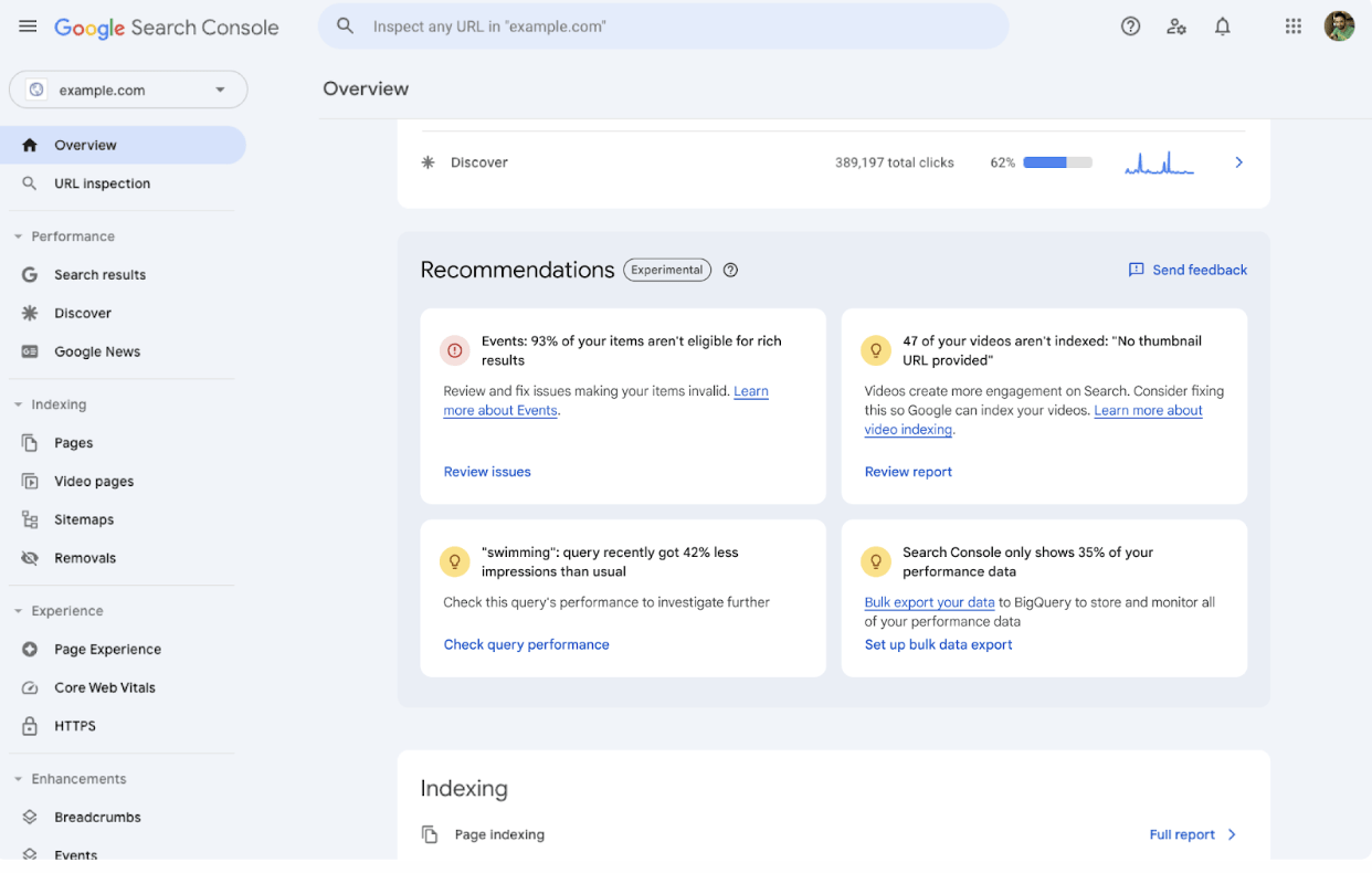 According to Google: “Recommendations are based on a variety of Google Search systems data, like indexing, crawling and serving. The data was already available to you on Search Console, but now we’re helping to make it more accessible by providing direct recommendations. They can help you prioritize your search optimization efforts, such as using structured data to help Google understand your content, adding sitemaps, and checking out trending queries and pages. The recommendations are computed on a regular basis and may expire or change details over time.”