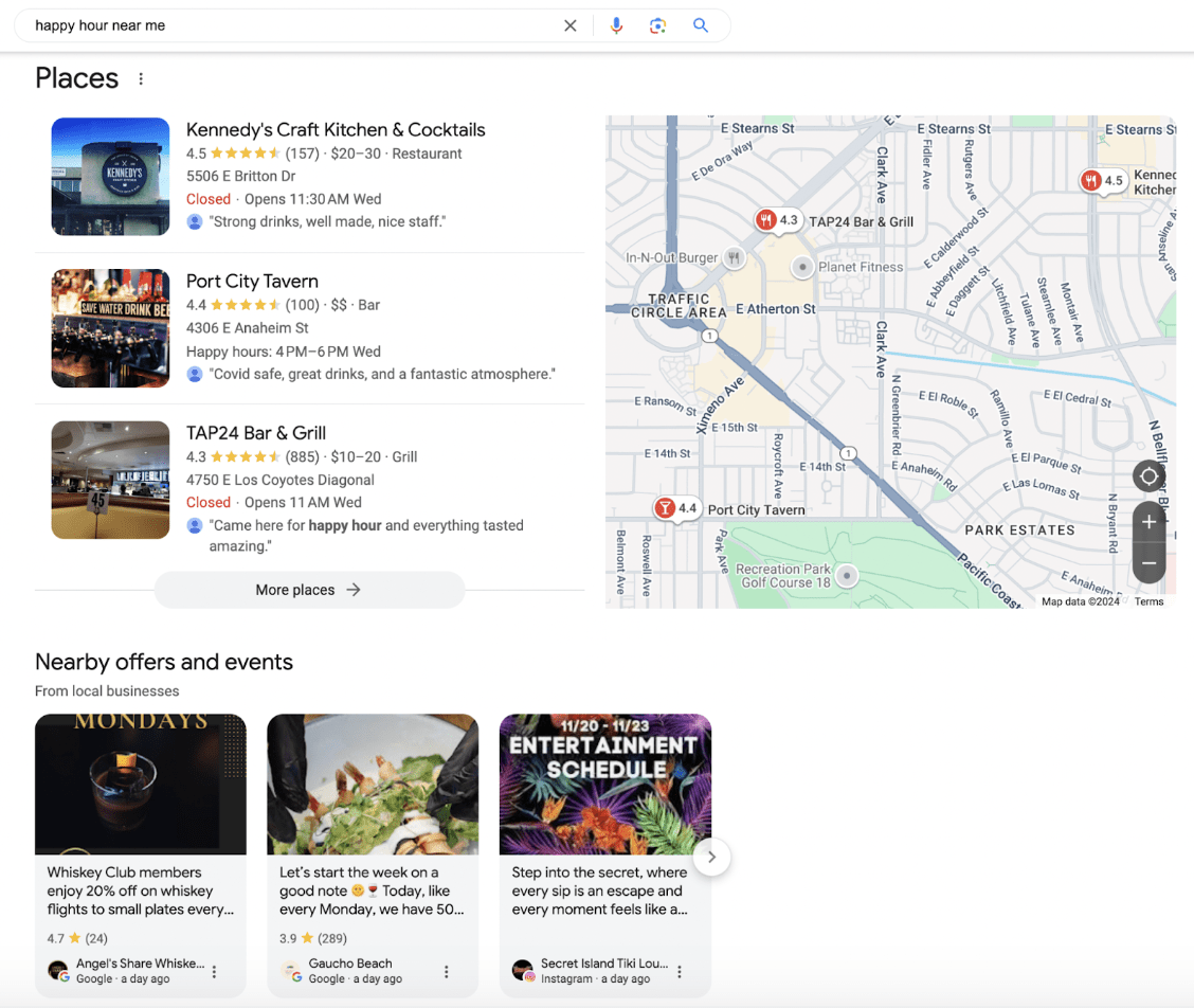 Despite regular assertions that Google Posts are all but dead, Google continues to expand the “Nearby events and deals” feature for local Food & Beverage industry search results.