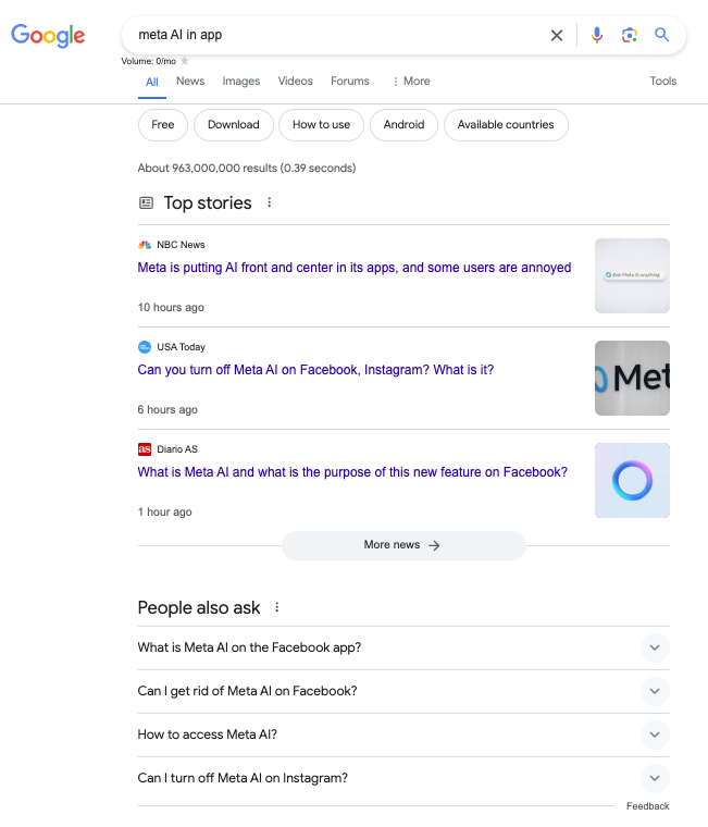 While the user experience may seem confusing, the search bar works just as any other search bar would work in Meta apps. Now, though, Meta integrates AI if a specific topic is entered that falls outside the realm of searching for groups, friends, and family.