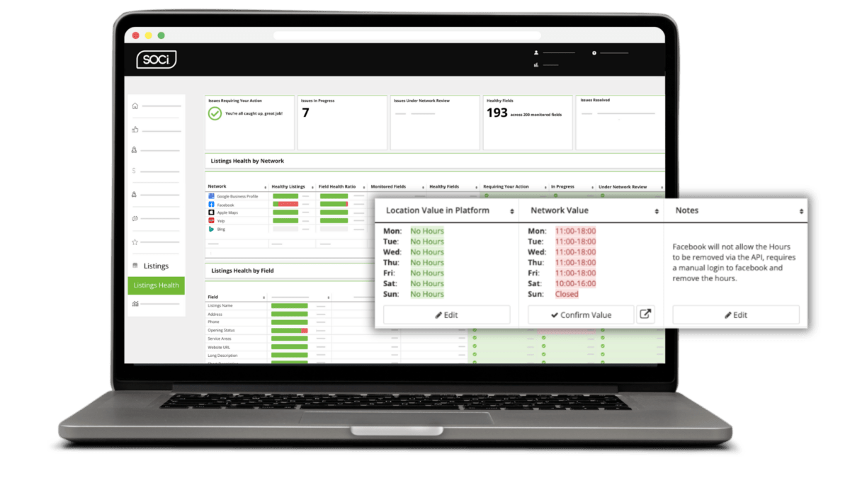 As a part of our SOCi Listings product, Listings Health lets you gain access to a powerful dashboard that works around the clock to keep your listings as accurate and consistent as possible across major platforms like Google, Facebook, Yelp, Bing, and Apple. By proactively scanning for discrepancies daily, auto-syncing your location data upon detection of a mismatch, and providing detailed insights to any mismatches that require your attention, Listings Health makes maintaining the accuracy of your listings easier than ever, helping you build stronger customer trust and enhance engagement.